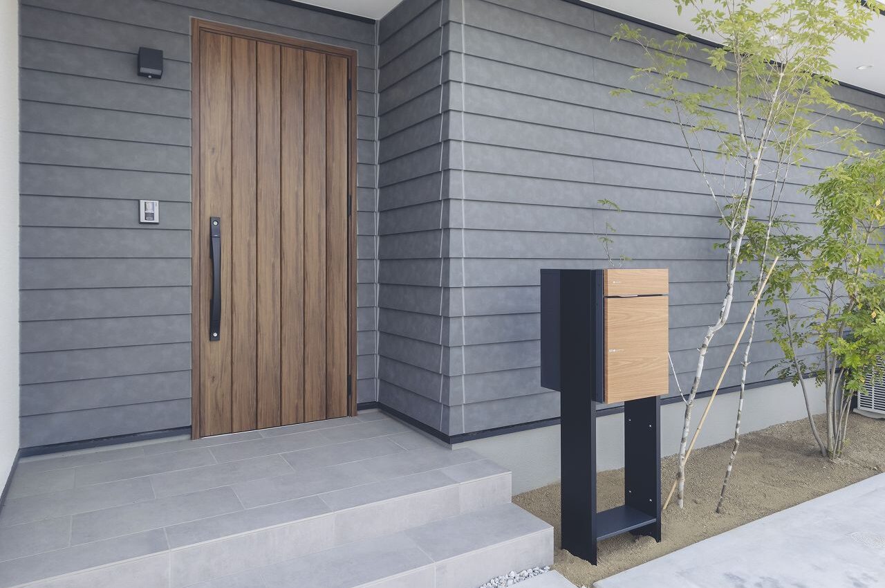 白い塗り壁とダークグレーの外壁材を組み合わせ、モダンで洗練された印象に仕上げた外観デザイン。