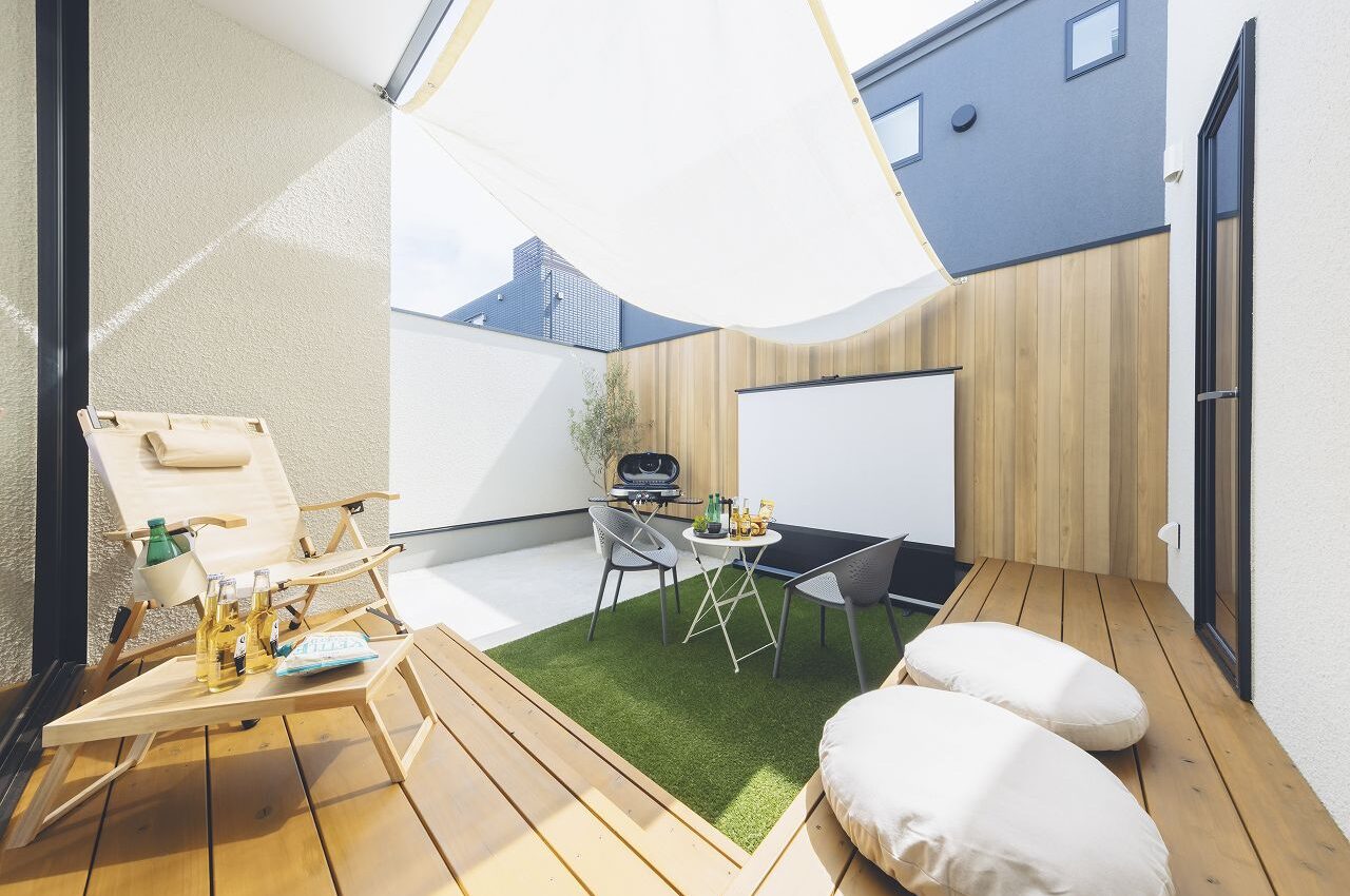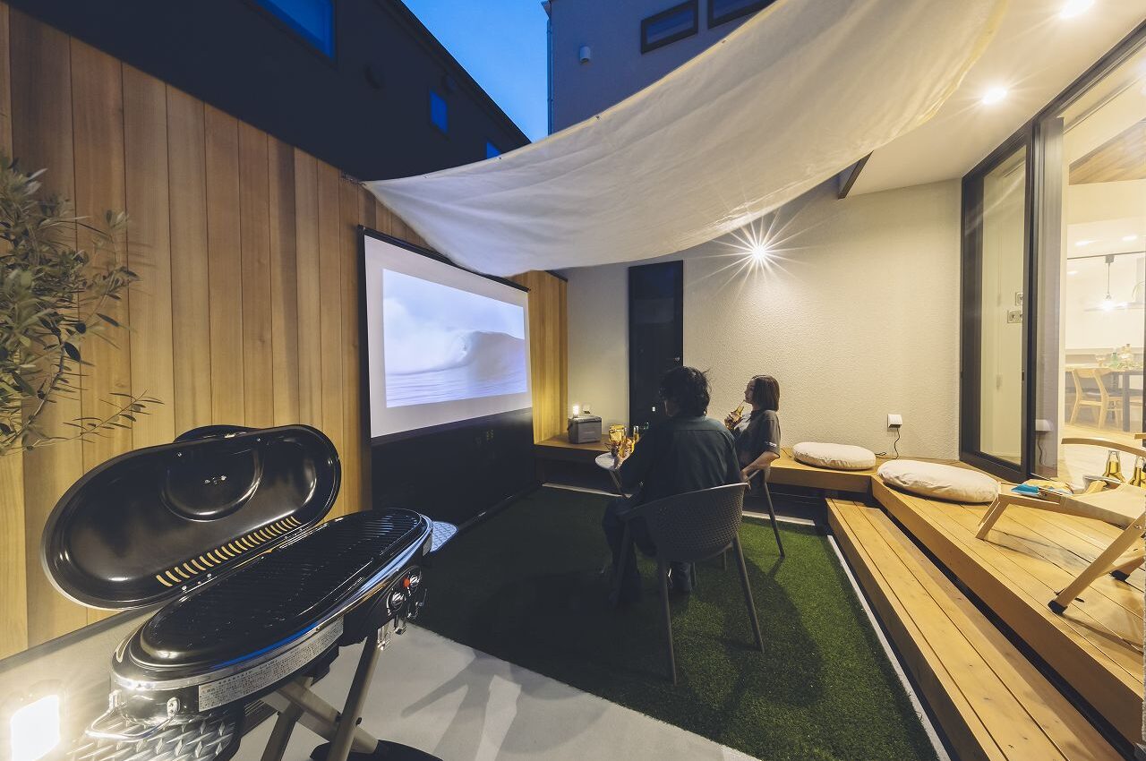 中庭に設置したホームシアターもご覧いただけます!