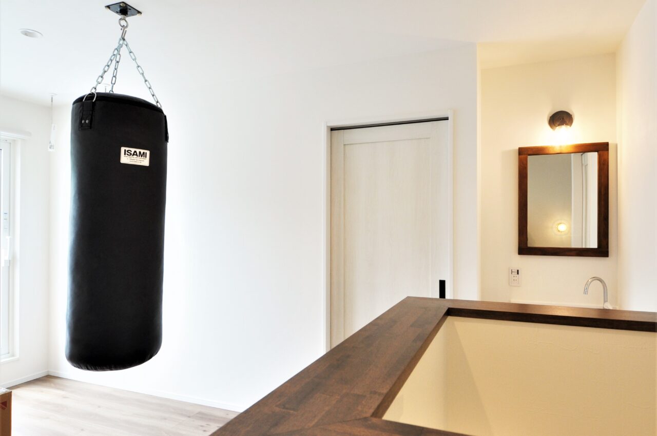 LDKに面した小上がりの和室はロールスクリーンを付け、間仕切ることも可能に。お子様のお昼寝やごろ寝スペースとして重宝しそうです。キッチン背面のドアはパントリーと奥様の家事コーナー。LDKが見える内窓を設置し、お子様を見守りながら自分時間を楽しめる空間に仕上がりました。子供室は将来仕切れるようドアを2つ設置し可変性をもたせました。2階ホールには格闘技が趣味のお施主様のご要望で本格的なサンドバックを設置した、遊び心あふれるこだわりの住宅となりました。