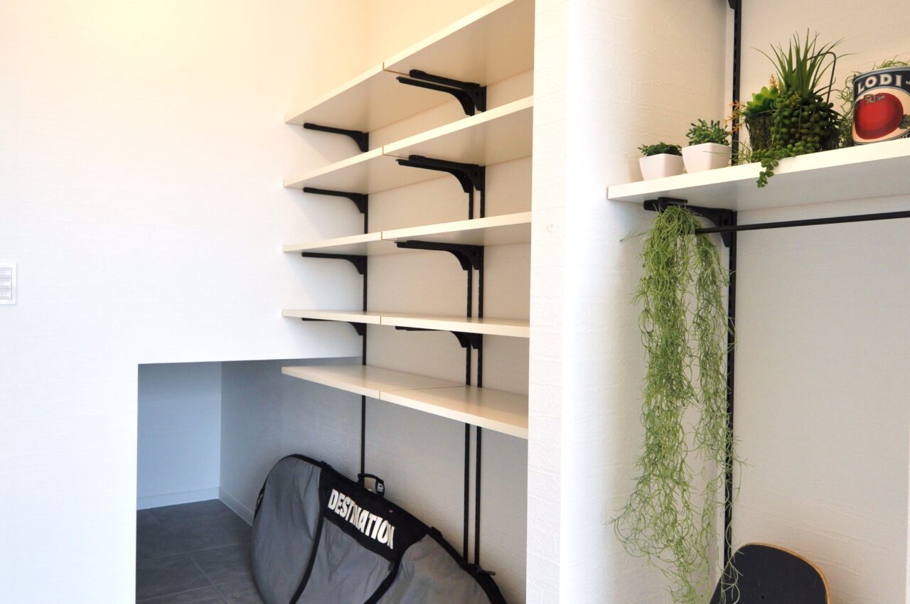 サーファーズハウスには欠かせないカバードポーチとウッドデッキ、そしてラップサイディング。 日当たりも最高な立地で太陽と青い空が似合います。 SCLはサーフボードの収納を考え、階段下のスペースを有効利用して奥行きを出しました。 LDKには大胆な色柄の輸入クロスを貼り、インテリアが一際引き立つ空間になりました。