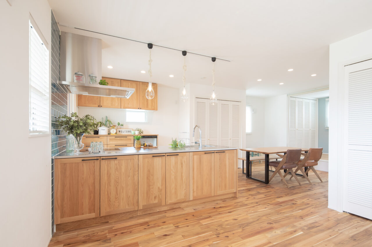 定番のカリフォルニアスタイルの中に、ポップな柄の輸入クロスや、モールテックス仕上げの洗面台など、お施主様のこだわりが詰まった遊び心溢れる住宅が完成しました。