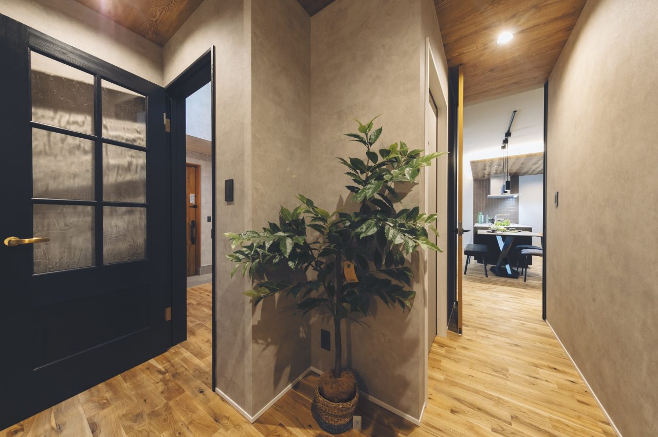 ドアを開けると、吹き抜けと鉄骨階段が作り出す明るく開放的な玄関が広がる。