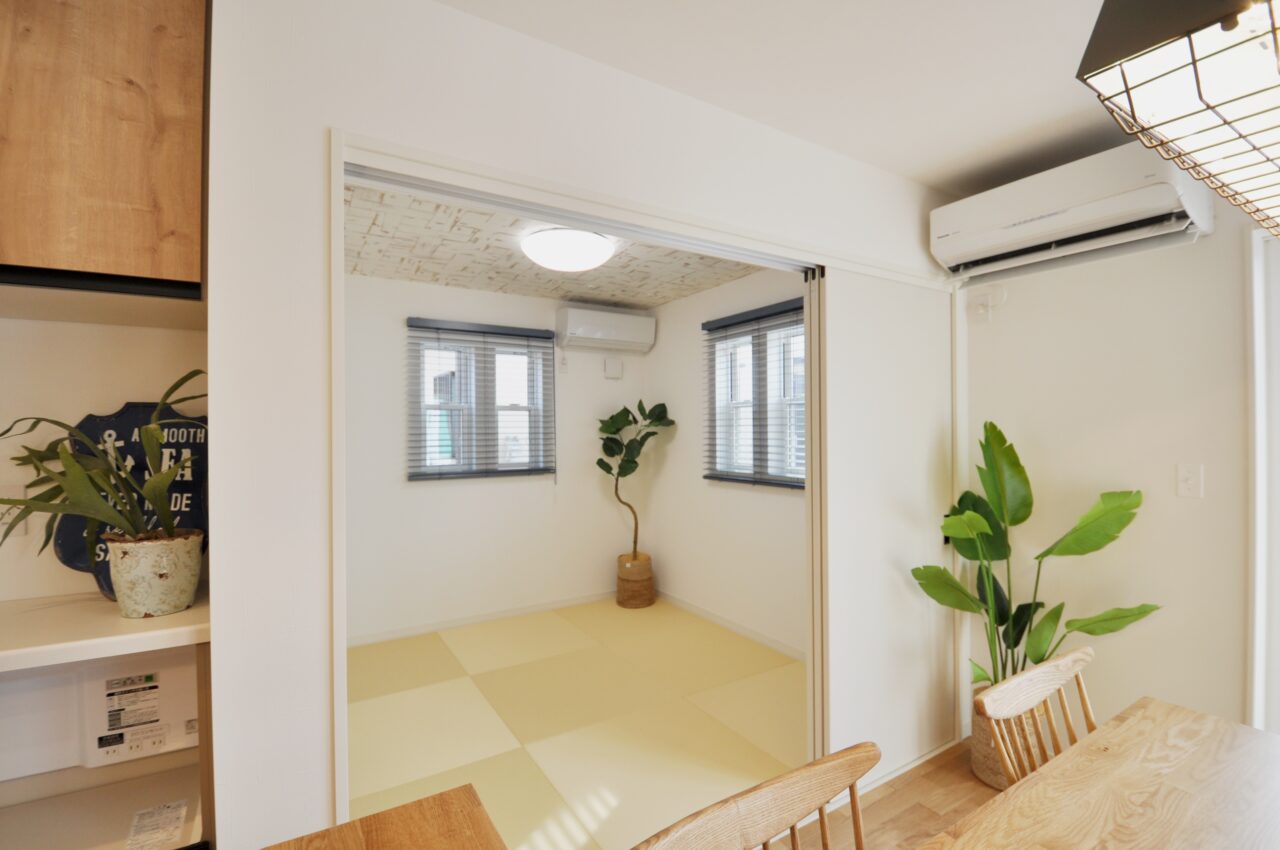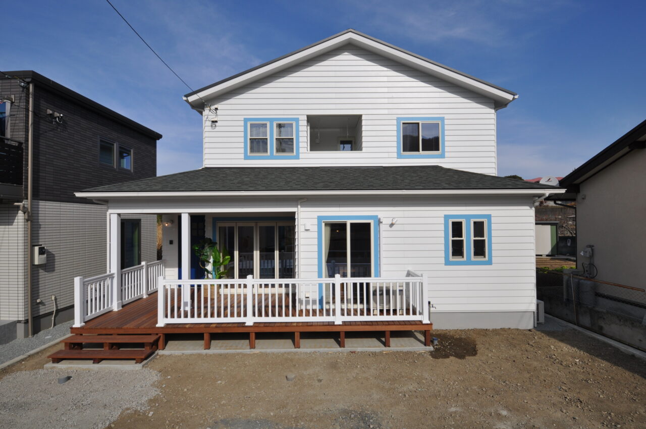 奥行きのあるカバードポーチが一際目を引くカリフォルニアハウス。 キッチン裏には家事室を設け、カウンターを設置。 子供室にも造り付けのカウンターを設置しました。 お施主様のイメージそのものの、爽やかで鮮やかな色使いで笑顔溢れる家が出来上がりました。